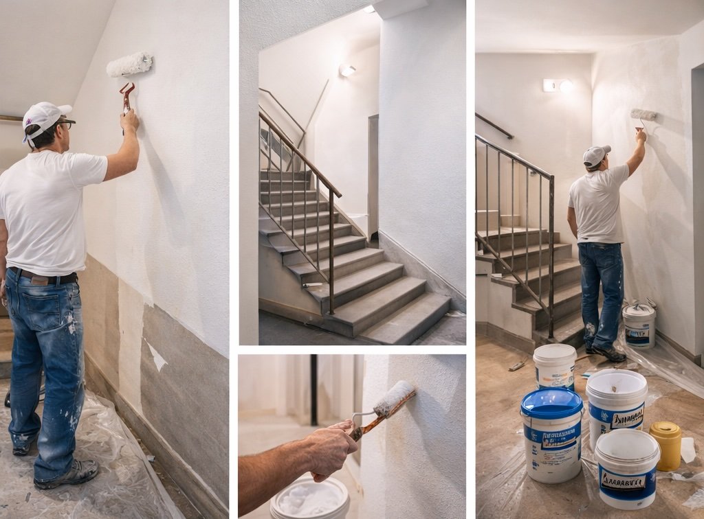 • Imbiancature e riverniciature di scale, corridoi, soffitti e pareti comuni, con materiali di qualità e finiture resistenti.
