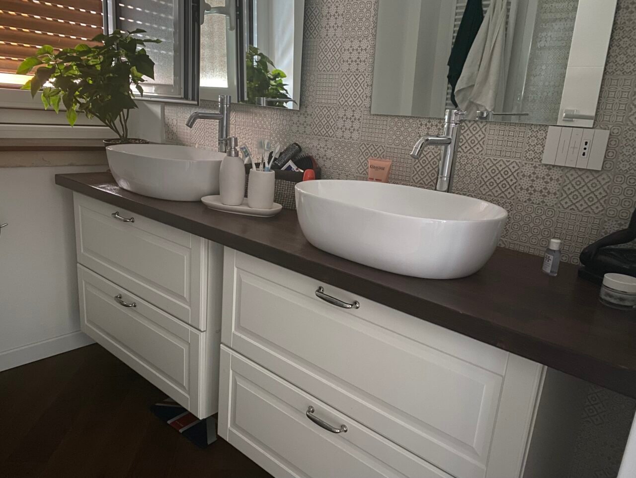 La ristrutturazione è partita da un’attenta fase di progettazione, fondamentale quando si introducono materiali come il parquet in un ambiente umido. Dopo il sopralluogo iniziale, abbiamo studiato una soluzione che garantisse continuità estetica, senza rinunciare alla resistenza e alla durabilità dei materiali.